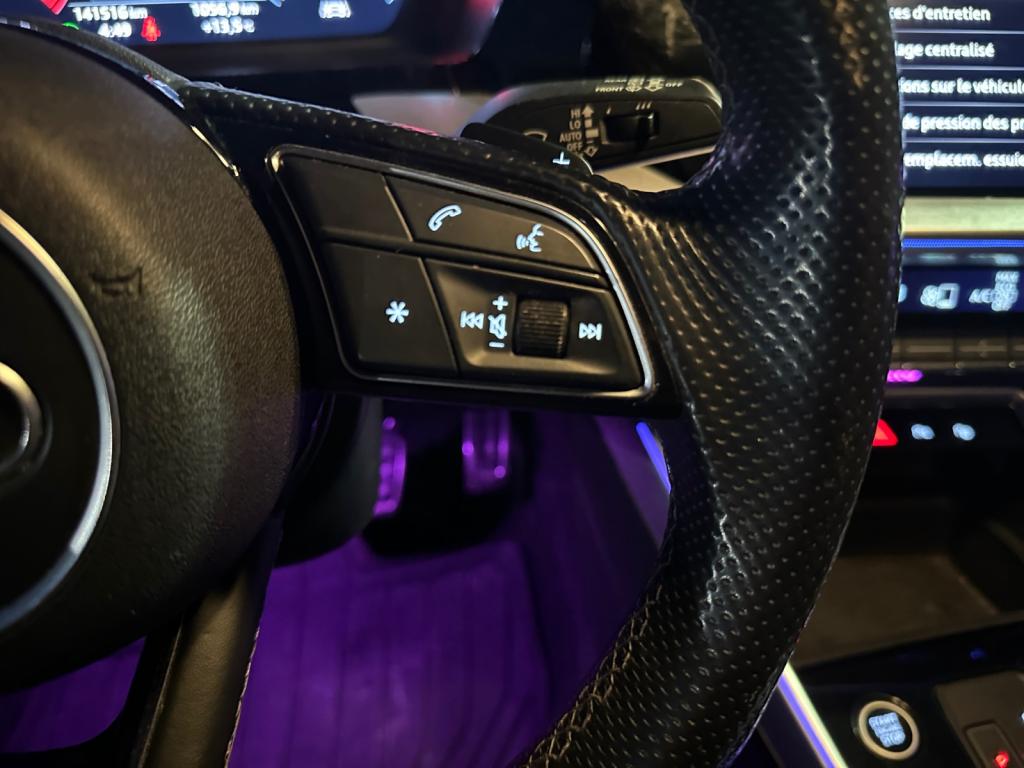 2 prises USB à l'arrièreAirbags latéraux à l'avant, avec airbags de têteAppel d’urgence Audi connectApplications décoratives en aluminium spectre foncéAudi connect Appel d’urgence & ServiceAudi Drive SelectAudi Park AssistAudi pre sense frontAudi smartphone interfaceAudi sound system : 10 haut-parleurs incluant un haut-parleur central et un subwoofer ; amplificateur à 6 canaux avec une puissance totale de 180 wattsAudi virtual cockpitAvertissement de sortie de voieBanquette arrière rabattable 40/60Caméra de reculCiel de pavillon en tissu noirClé à fréquence radio (sans safelock)Climatisation automatique confort 2 zonesCommande de désactivation d'airbag passager avantContrôle de la pression des pneumatiquesDétecteur de pluie et allumage automatique des projecteursDirection assistée électromécanique asservie à la vitesseEcrous antivolI-Size et Top Tether pour les sièges arrière extérieursInterface BluetoothJantes en alliage léger, 5 branches en Y, Gris Graphite, tournées brillantes, dimension 8,0J x 18 avec pneus 225/40 R18Kit anticrevaison (compresseur et produit de colmatage)Limiteur de vitesseMMI navigation plus avec MMI touchOutillage de bordPack Eclairage intérieurPack Extérieur S linePack Intérieur S linePare-brise avec isolation acoustiquePeinture verniePhares à LED avec clignotants dynamiques à l’arrièreRappel de ceinture de sécurité avec dispositif arrière de détection d’occupation du siègeRéception radio numérique (DAB)Régulateur de vitesseRétroviseur intérieur à position nuit automatique, sans encadrementRétroviseurs extérieurs couleur carrosserieRétroviseurs extérieurs réglables, dégivrants, rabattables électriquement avec fonction rabat automatique (côté passager avant, marche arrière enclenchée) et fonction jour/nuit automatique des deux côtésSécurité enfant électriqueSièges avant réglables manuellementTrousse de secours, triangle de présignalisation et 2 vestes de sécuritéVolant 3 branches multifonctions plus en cuir et palettes de changement de vitesses