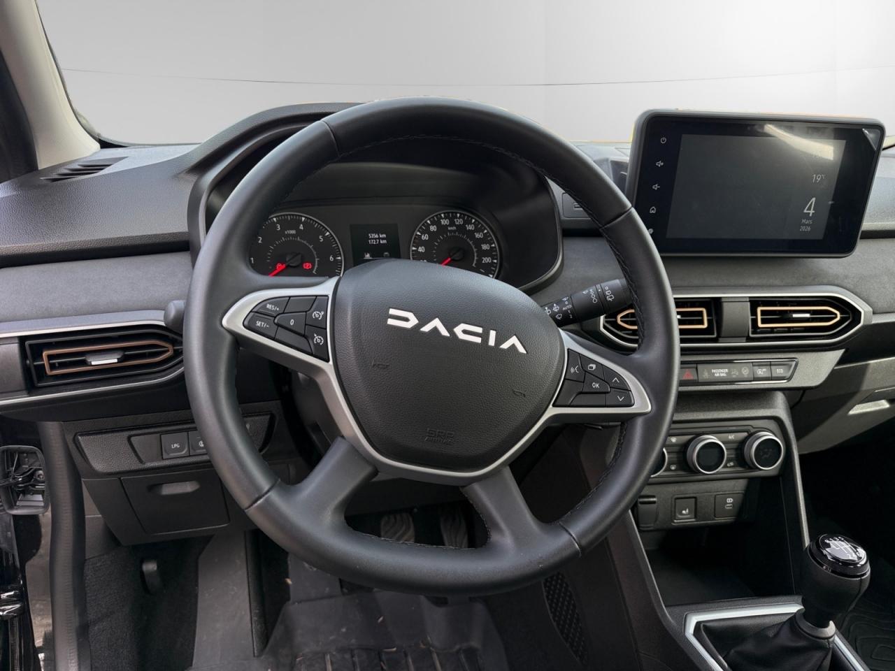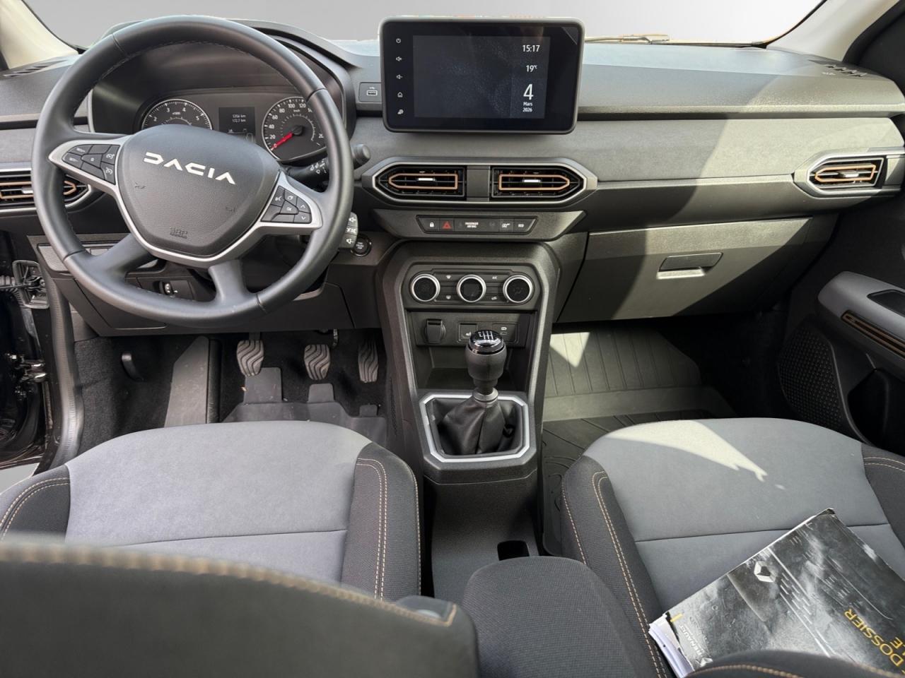 ABS avec aide au freinage d'urgenceAccoudoir central avantAide au démarrage en côteAide au stationnement arrièreAirbags conducteur et passagerAirbags latéraux thorax + rideaux avant et arrièreAppel d'urgence - EcallBanquette arrière rabattable et fractionnable 1/3-2/3Barres de toit longitudinales modulaires (gris quartz)Boucliers avant et arrière ton carrosserieBoutons de commandes volant pour ordinateur de bordCalandre avec inscription "Stepway" chroméeCalandre chroméeClimatisation manuelleCondamnation automatique des portes en roulantCondamnation des portes électrique avec télécommande à radiofréquencesContours des aérateurs chrome satin et orange cuivreContrôle de pression des pneus ( TPMS )Direction assistée électriqueEclairage du coffreEnjoliveur Orange sur les accoudoirs des portes avantEnjoliveurs Flexwheel 16” Saria - gris foncé avec logo Dacia chroméEPS : Contröle électronique de stabilitéEssuie-glace à déclenchement automatiqueFeux de brouillard avant avec enjoliveur chroméFeux de jour automatiques à LEDFreinage actif d’urgence (AEBS Interurbain)Kit de gonflageLève-vitres arrière électriquesLève-vitres impulsionnel anti-pincement conducteur et électrique passager avantLimiteur de vitesse avec avertisseur sonoreMedia Display 8” : Radio DAB + smartphone replication via câble USB, connexion Bluetooth, 4 haut-parleurs, écran tactile 8” + support téléphone amovibleMiroir de courtoisie côté conducteur et passagerOrdinateur de bord : distance parcourue, vitesse moyenne, autonomie, consommation moyennePlancher de coffre modulable à deux niveauxPoignées de maintien avant (côté passager) et arrièrePoignées de porte extérieures ton carrosserie de type réfrigérateurPoignées de portes intérieures finition chrome satinéPommeau de levier de vitesse avec insert chroméPrise 12V à l'avantPrise USB avantProgramme Eco-modeProjecteurs antibrouillardProtection de passages de roue et bas de marche noirsRégulateur de vitesseRétroviseurs extérieurs couleur carrosserieRétroviseurs extérieurs réglables électriquementRevêtement tissu sur la planche de bord et accoudoirs portes avantSellerie Stepway à insertions et surpiqures orangeSiège conducteur réglable en hauteurSignature lumineuse à LEDSkis avant/arrière chromésSystème de contrôle de trajectoire (ESC) avec fonction antipatinage (ASR)Système de fixation Isofix pour siège enfant aux places latérales arrièreSystème Stop & StartVitres teintéesVolant réglable en hauteurVolant réglable en profondeurVolant Softfeel